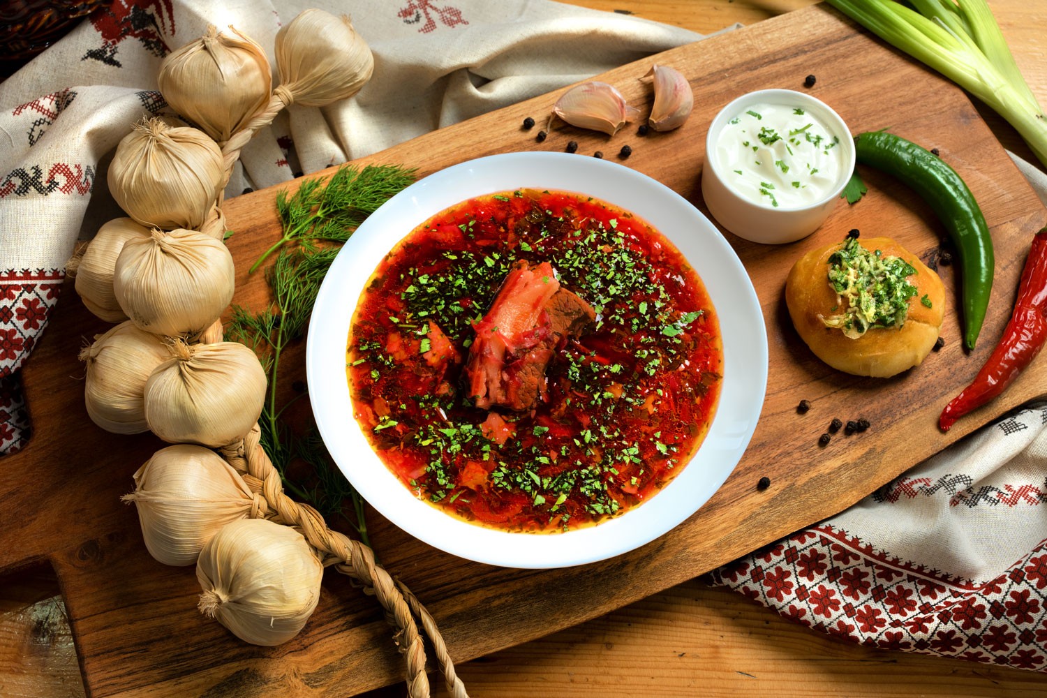 Un piatto ricco e confortante: barbabietola rossa, patate, cavolo, fagioli, carote e peperoni dolci si uniscono in un brodo saporito, arricchito con pancetta e spezie. Servito con un morbido pane all'aglio fatto in casa, completato da un tocco di panna acida.