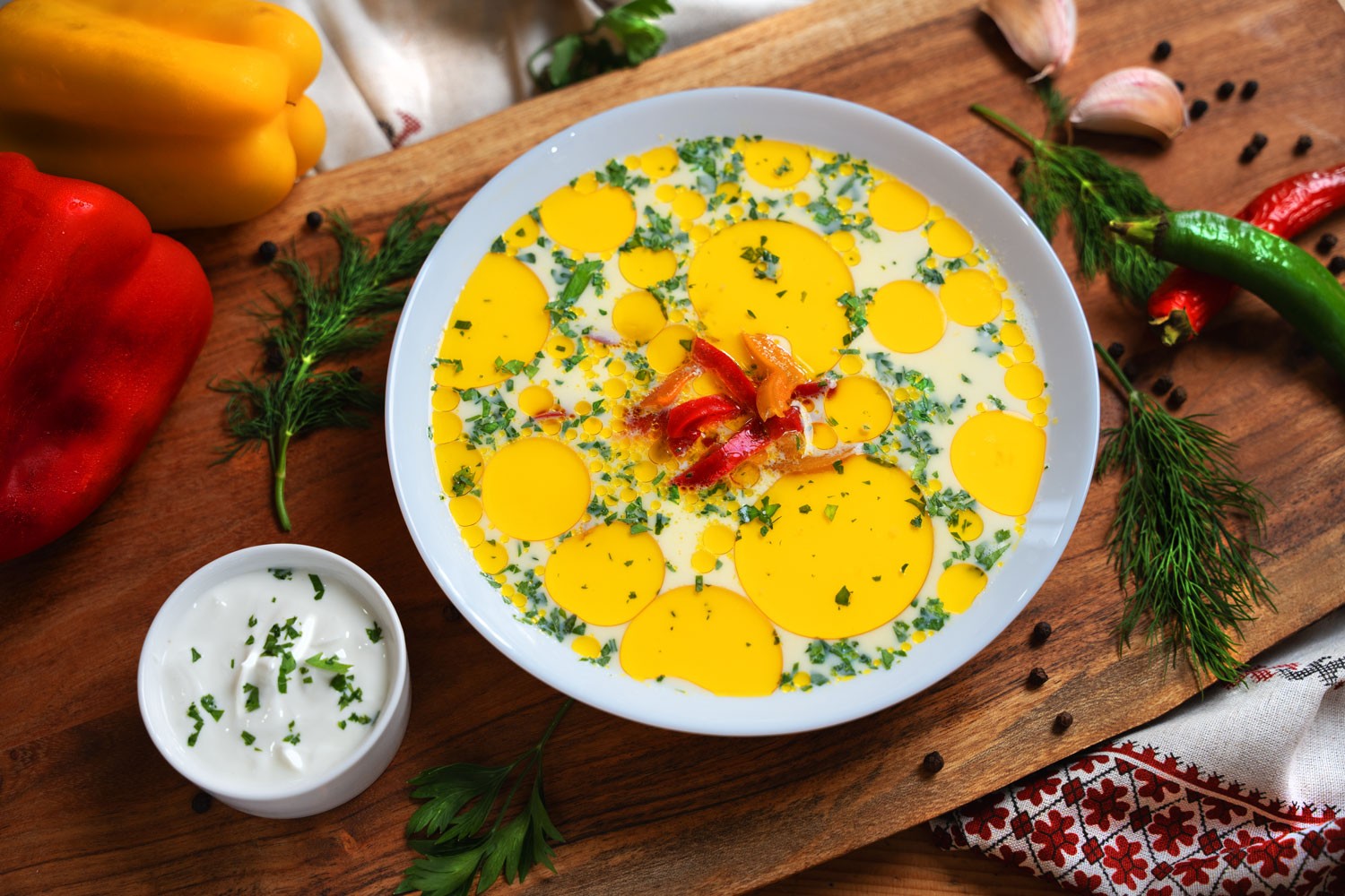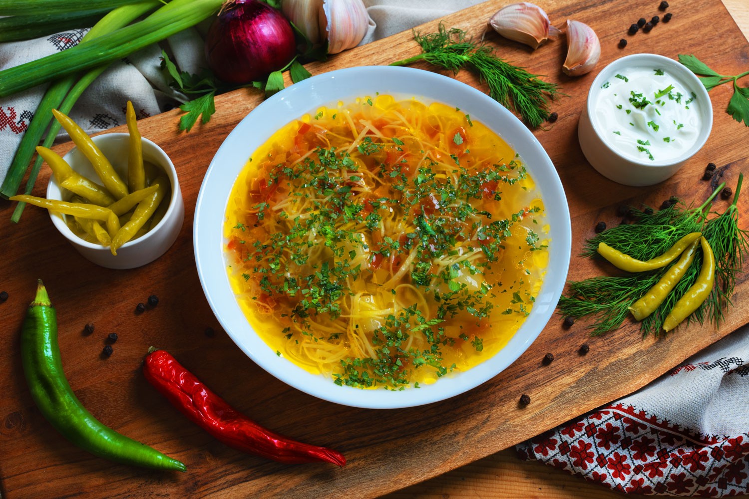 Delicata e avvolgente, con brodo di pollo ricco, carne tenera, tagliatelle, cipolle, carote, e peperoni dolci. Arricchita da aglio, spezie, prezzemolo, aneto e un tocco di panna acida. Un'esperienza di gusto che riscalda e soddisfa.