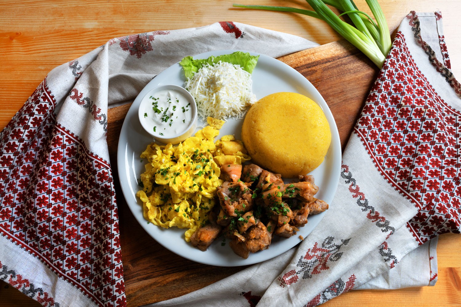 Gustoso spezzatino di maiale con cipolla, aglio e spezie, servito su polenta cremosa a base di burro, latte e farina di mais, formaggio di pecora, uova di gallina e panna acida. Completato da verdure fresche.