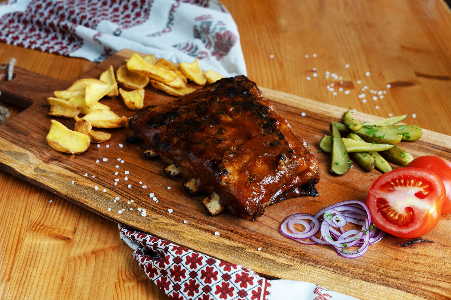 Deliziose costine di maiale glassate con salsa barbecue a base di salsa di soia, aglio, spezie e concentrato di pomodoro. Servite con patate al forno, salsa adjic e un’insalata di cavolo marinato con cipolle, olio di girasole e verdure. Un'esperienza di gusto completa e appagante.