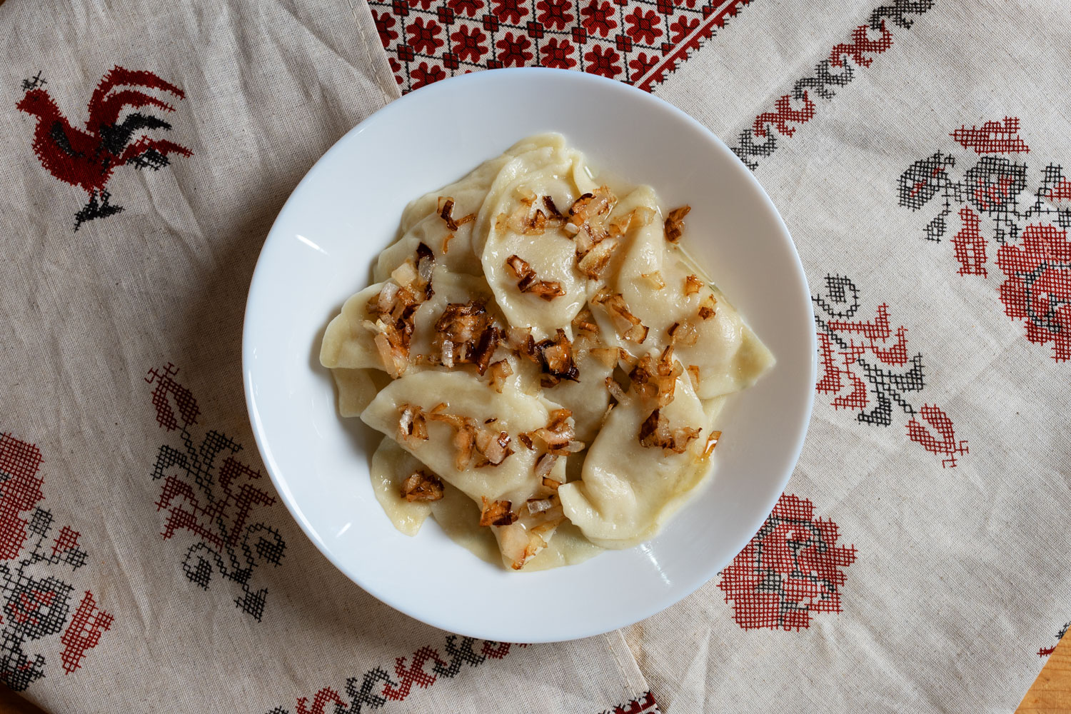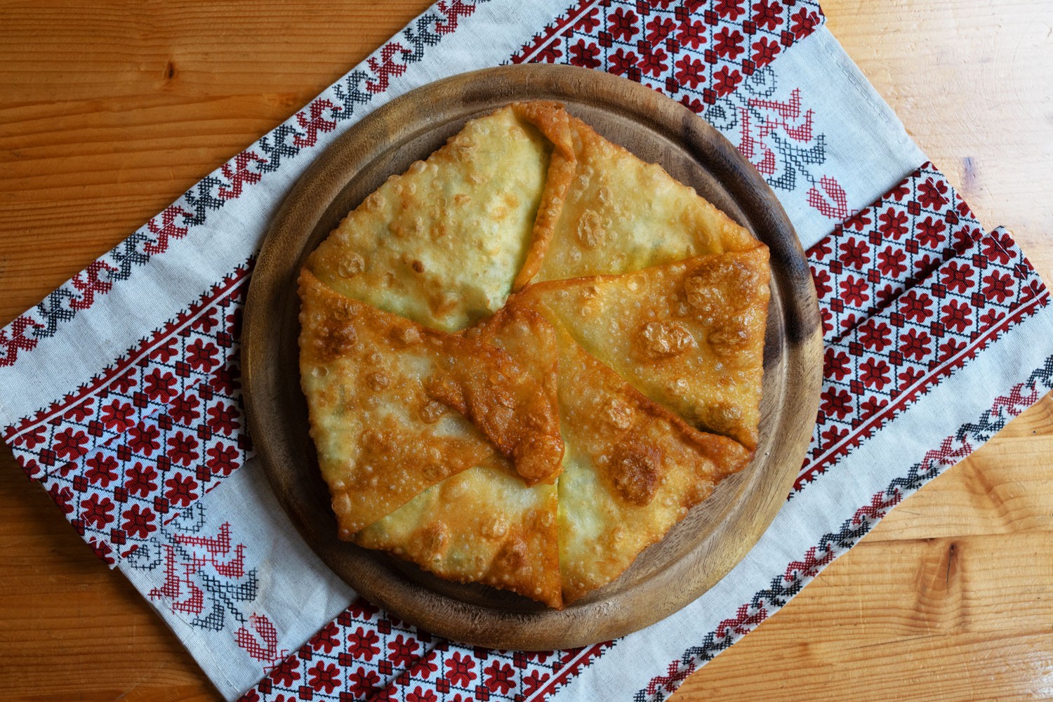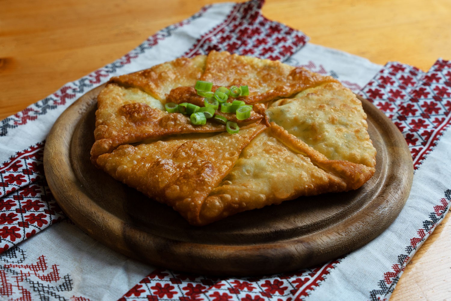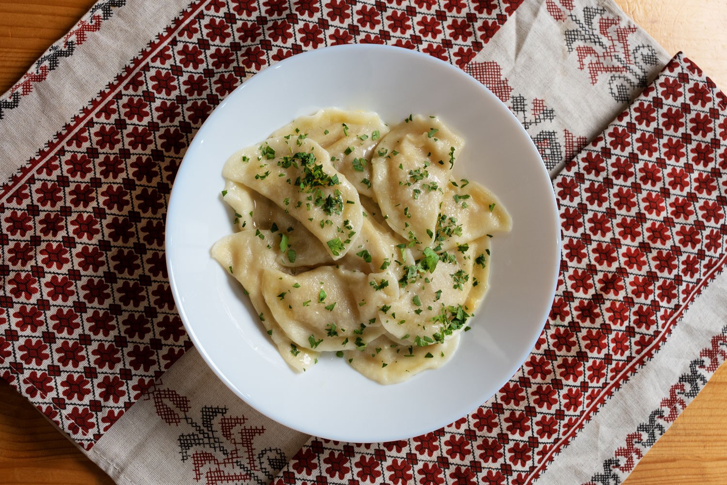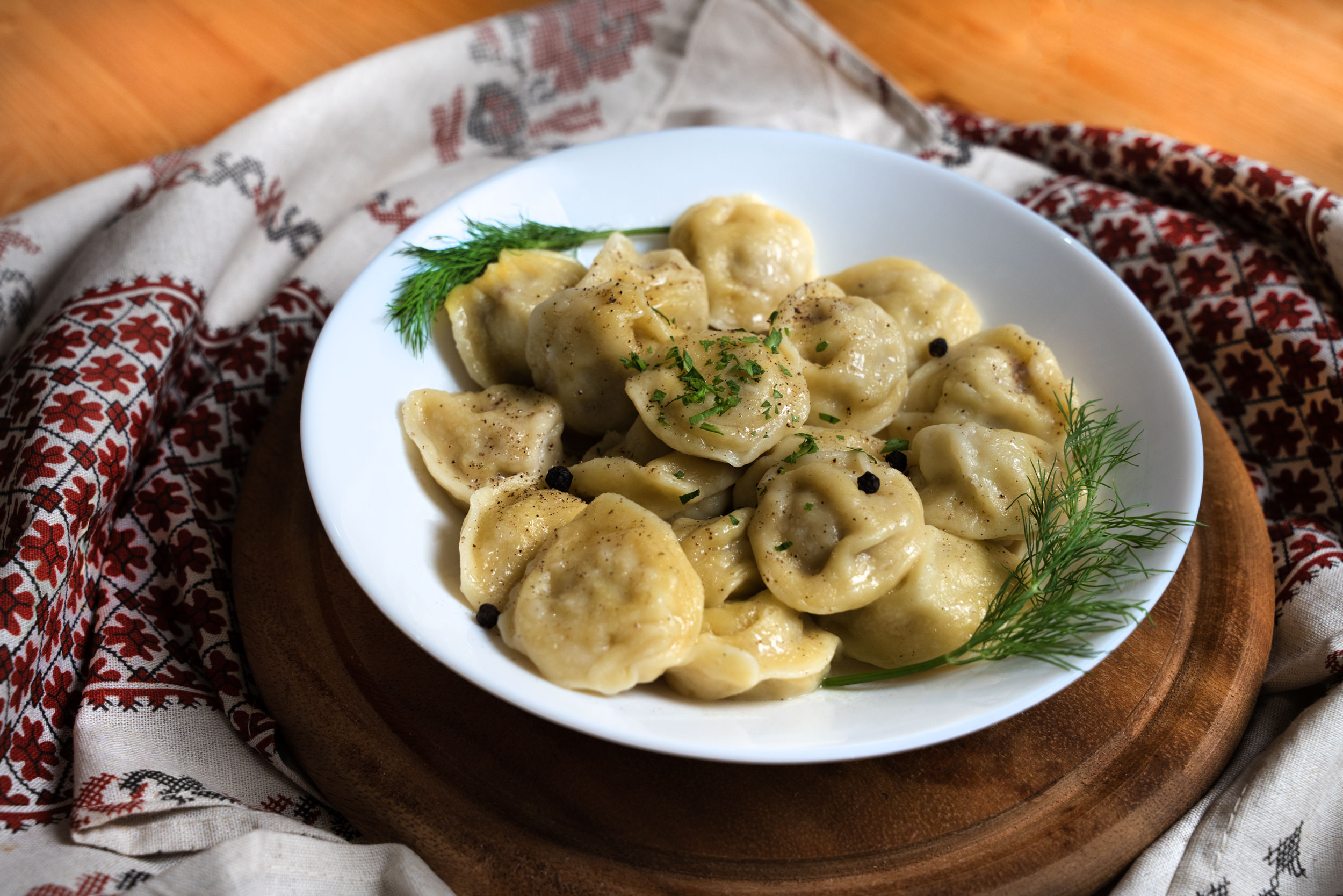 Deliziosi varenyky artigianali, ripieni di patate e cipolle, preparati con farina di frumento e un tocco di spezie. Serviti con burro fuso e verdure fresche, per un piatto semplice e ricco di tradizione.